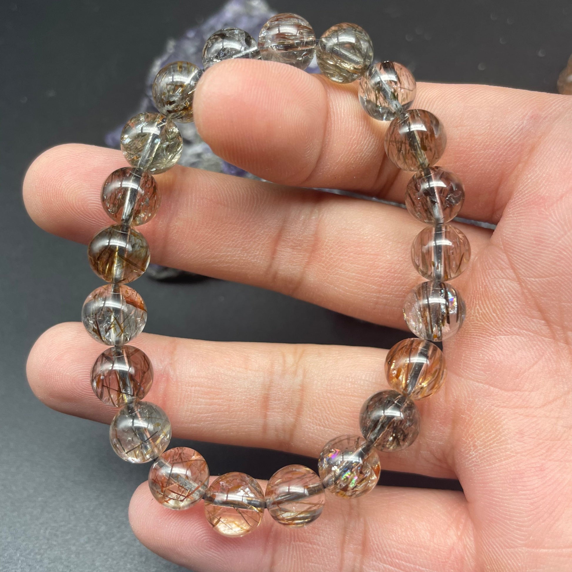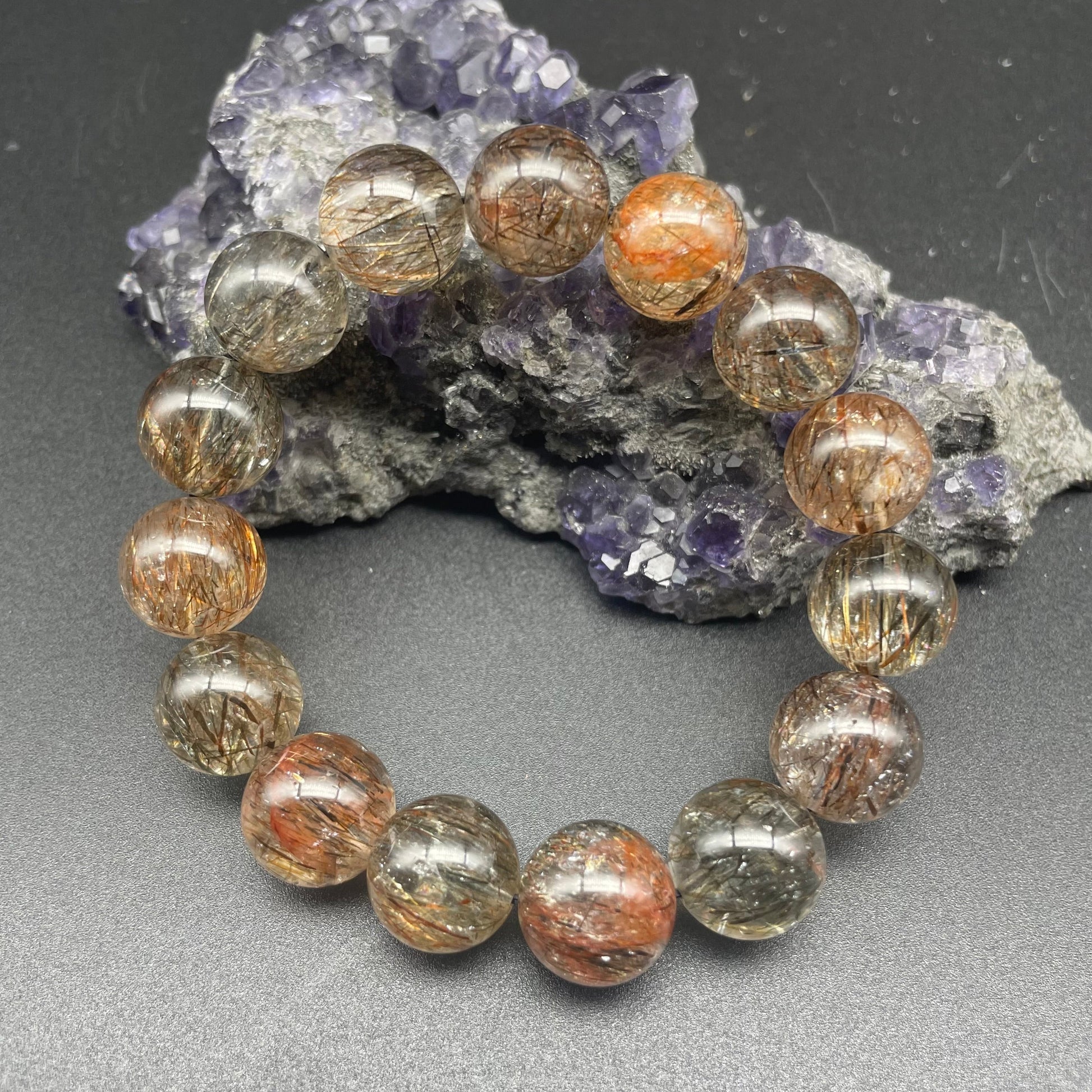 或黑金超七(雙輪骨幹),雙輪是指晶體中的共生發:(金生發與黑色發)與金的一個發絲也成超七水晶界比較獨特的水晶,黑金超七是產量比較稀少,它的整體的成色是晶體中的發絲清晰且晶體通透乾淨無雜,獨特的發絲呈黑金雙色,發絲清晰而伴有閃閃發光的雲母片共生,在光線底下是有一種高貴的輕奢侈的氣質。